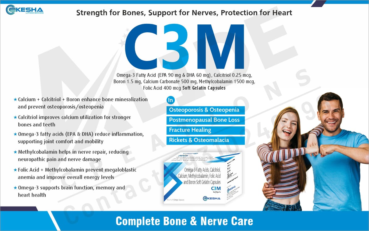 C3M Soft Gelatin Capsules are a scientifically formulated combination of Calcium, Calcitriol, Boron, Omega-3 Fatty Acids, Methylcobalamin, and Folic Acid designed to support bone strength, nerve health, and heart protection. It helps prevent and manage conditions related to bone loss, joint pain, and nerve weakness, making it an ideal supplement for people with osteoporosis, osteopenia, and postmenopausal bone loss.