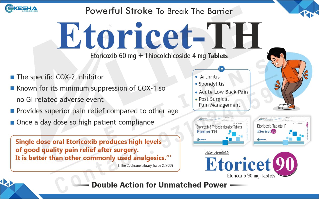 Etoricet-TH Tablets combine the power of Etoricoxib (60 mg) and Thiocolchicoside (4 mg) to provide rapid and long-lasting relief from pain, inflammation, and muscle stiffness. This dual-action formula is designed to treat musculoskeletal disorders such as arthritis, spondylitis, back pain, and post-surgical pain — ensuring improved mobility and comfort for patients.